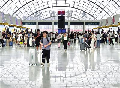 “慢慢走,来这里排队……”拖着行李,乘客陈女士招呼孩子们排队进站。她告诉记者:“孩子们放假了,我们打算去秦皇岛旅游,放松一下。”