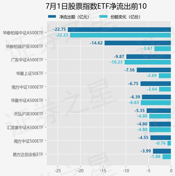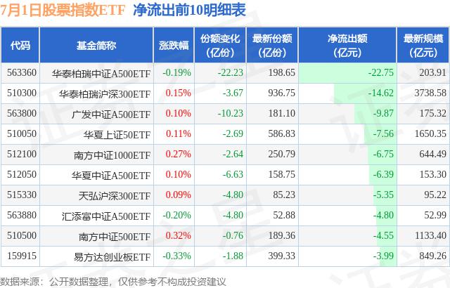 当天有 299 只股票指数 ETF 资金净流出,其中华泰柏瑞中证在净流出中排名第一。 A500ETF(563360)减少了份额 22.23 一亿份,净流出额为 22.75 亿元。