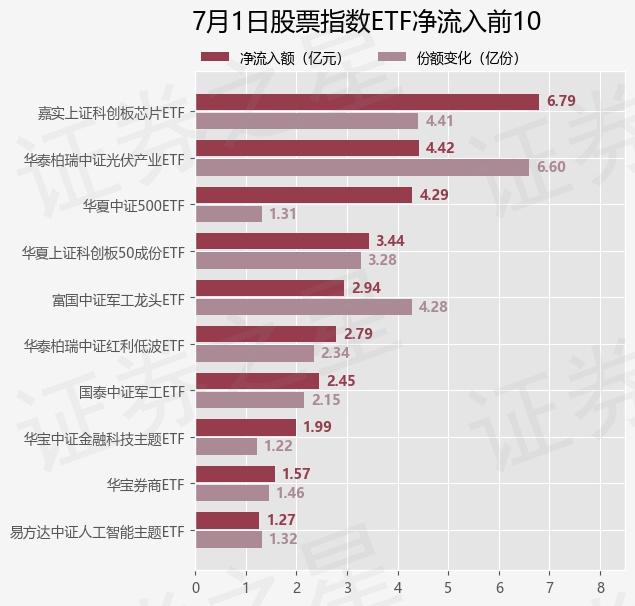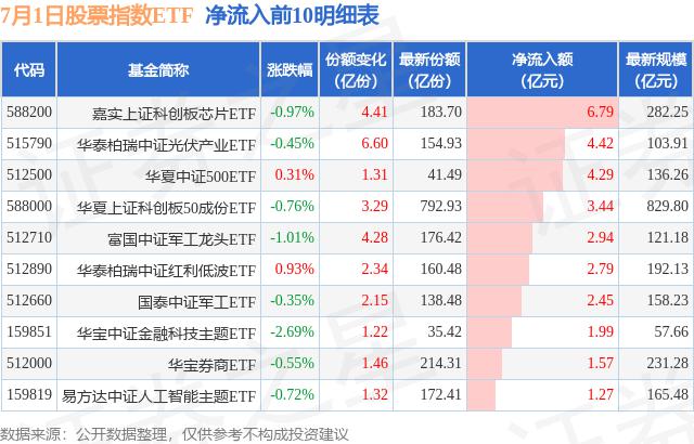 当天有 101 只股票指数 ETF 资金净流入,其中嘉实上证科技创新板芯片净流入排名第一。 ETF(588200),份额增加 4.41 十亿份,净流入额为 6.79 亿元。