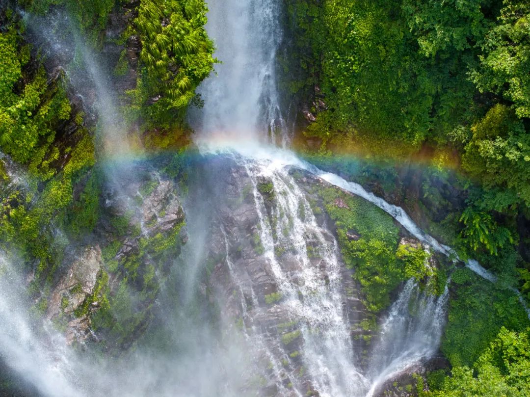 瀑布激发的水雾高达数米。