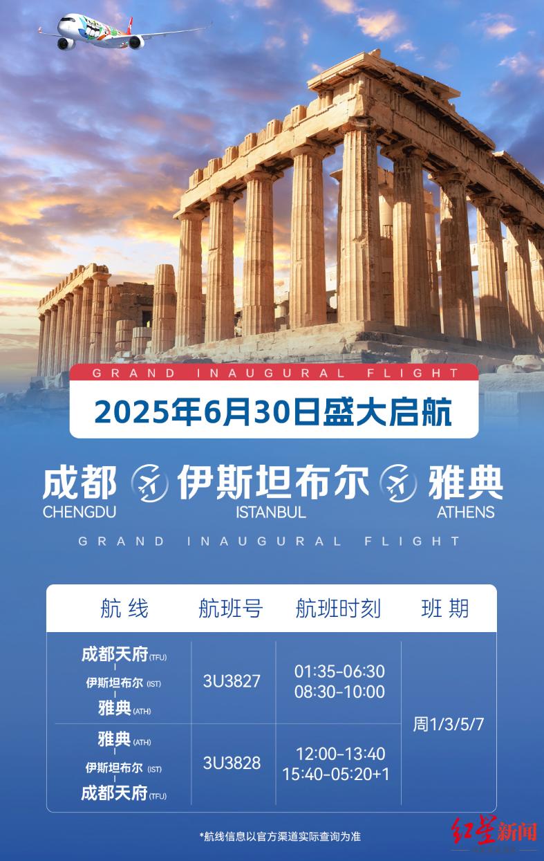从6月30日开始,中国向希腊增加了新的渠道。成都天府-伊斯坦布尔-雅典航线开通,成都成为继北京、上海之后中国大陆雅典航运的第三个城市。