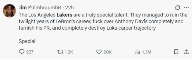 湖人队球迷:湖人队是一支非常有才华的球队,他们成功地摧毁了勒布朗生涯的最后阶段,完全欺骗了安东尼。 - 戴维斯,也破坏了东契奇未来的发展轨迹,严重影响了湖人队的整体形象。