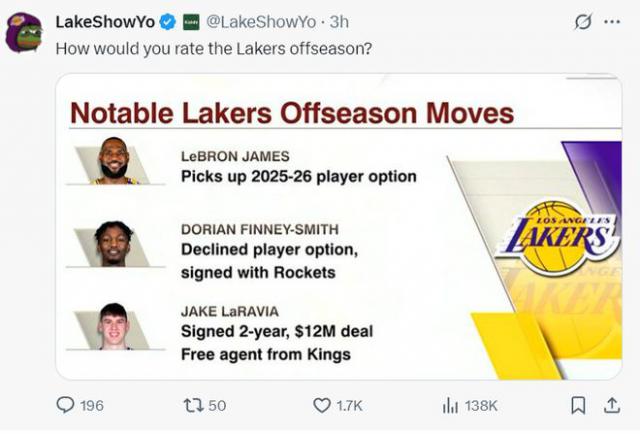湖媒写道:如何看待湖人队休赛期的运作,詹姆斯执行。 5260 一万名球员,芬尼史密斯离开球队,湖人队两年 1200 拉拉维亚签下了万签。