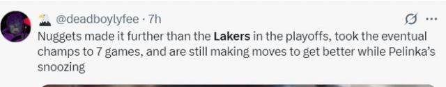 湖人队球迷:掘金队在季后赛中的表现远远超过湖人队,他们甚至将冠军雷霆逼入抢七,掘金队在休赛期努力加强人员调整,而佩林卡却无能为力。