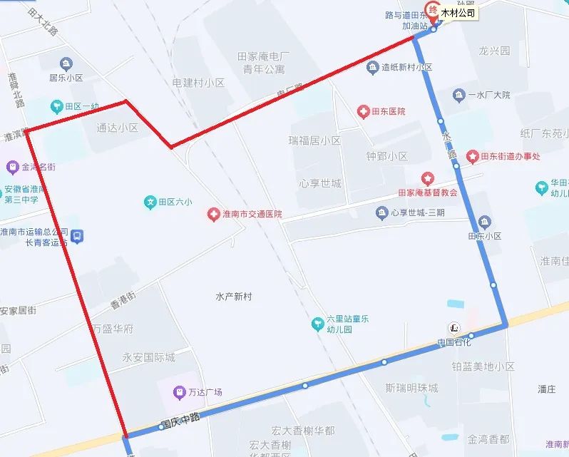 30路由“木材公司”站发班经电厂路、田大北路、淮滨路、淮舜北路、国庆路恢复原线运营。