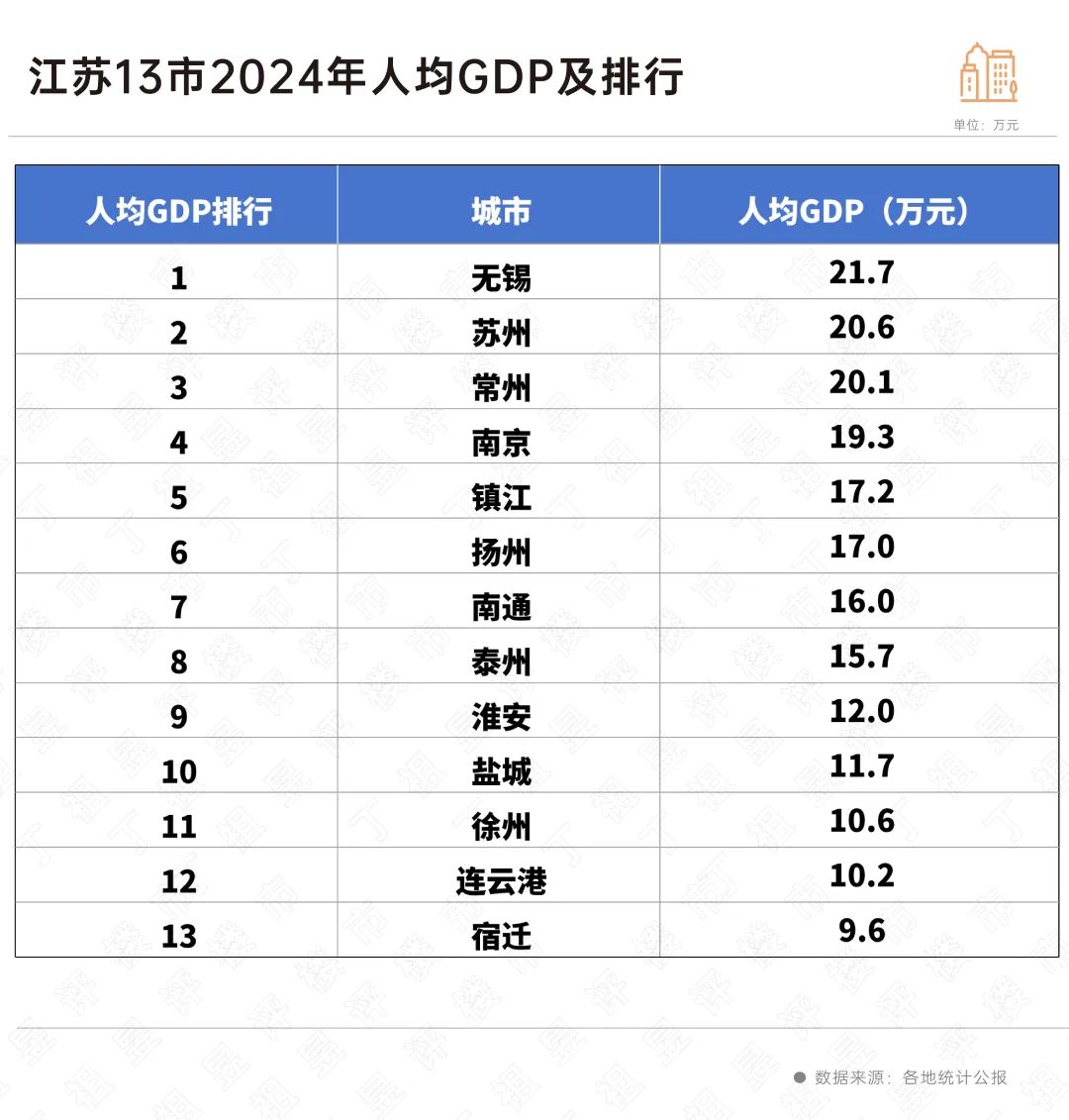 在这些城市中,有“苏南第二城”之称的无锡长期占据榜首,2024年人均GDP达到21.7万元。苏州排名第二,常州排名第三。