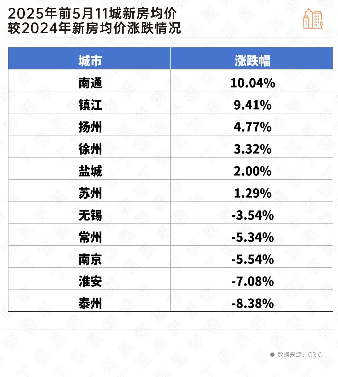镇江、扬州、徐州、盐城和苏州与2024年相比,前五月新房平均成交价格有所上涨,泰州、淮安等待前期需求透露的城市整体房价进入回调期。