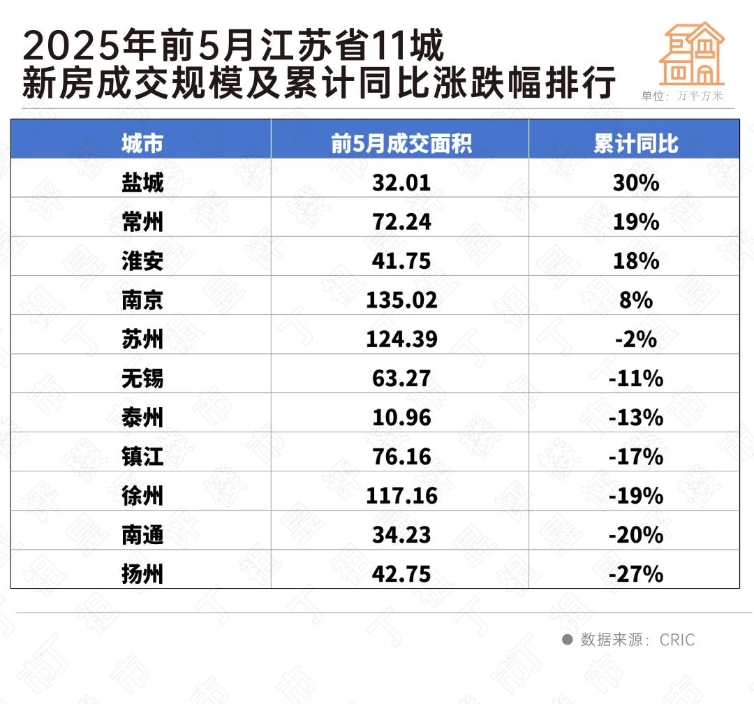根据累计交易趋势,统计了11个城市,盐城、常州、淮安、南京前五月累计同比增长。,其中盐城前五月成交额32.01万平方米,比去年同期增长30%,比去年同期增长11个城市。