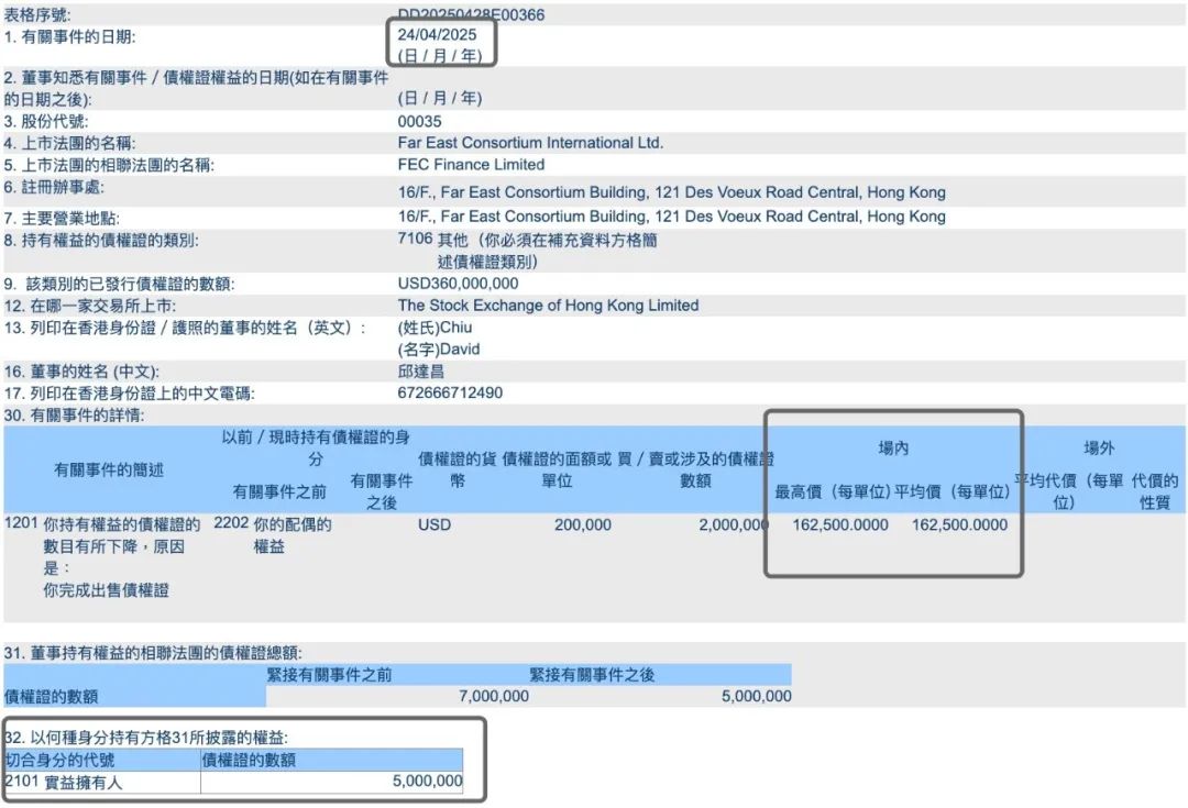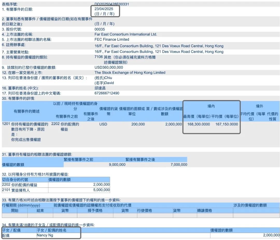 这条路的小伙伴们查询了港交所的披露,很容易发现,今年4月23日和24日,太太Nancy Chiu分两次清空了总成本400万美元的永续债券,总价约330万美元,几乎打八折。
