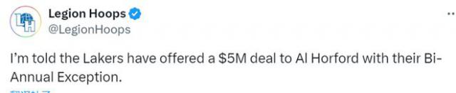 另外,据多家媒体报道,湖人队在签下艾顿之后,并没有停止对内线的加固。据报道,湖人队已经向老将霍福德开放了 500 万双年例外价格。
