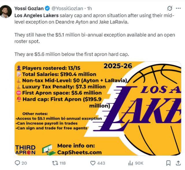 据工资结构专家报道,湖人队除了中产阶级之外,还签下了艾顿和拉拉维亚,湖人队还有一份。 510 除了万的双年例外,球队只剩下一个名额,湖人队比第一奢侈税线还差。 560 万美金。