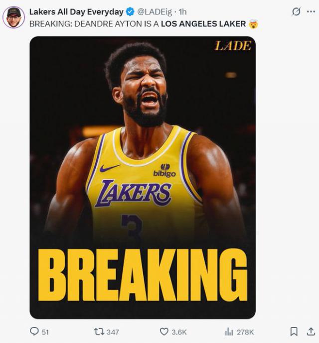 艾顿两年发布了1660万个细节:26年仍然赚3365万 进入湖人队的目的是明夏冲高薪