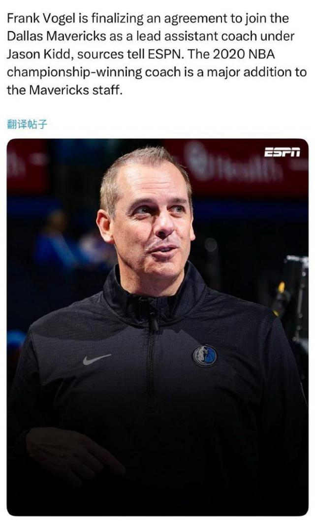 北京时间 7 月 3 日,根据 ESPN 名记 Shams 据报道,前湖人队冠军主教练沃格尔将加入独行侠教练小组,担任首席助教助理基德, 2020 湖人队夺冠赛季曾经是基德辅佐沃格尔。
