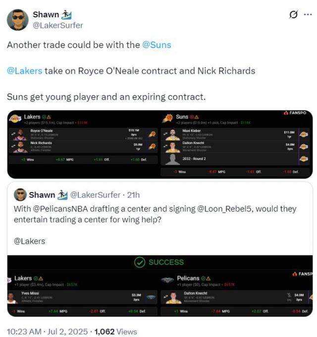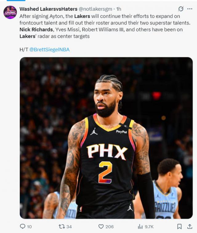 根据 NBA 记者 BrettSiegel 报道称,在签下艾顿之后,湖人队将继续努力扩大内部人才储备,尼克将围绕詹姆斯和东契奇两个超级巨人阵容展开。 - 理查兹,伊夫 - 米西,罗伯特 - 威廉姆斯是湖人队的心上人。