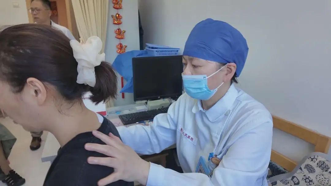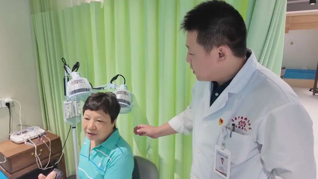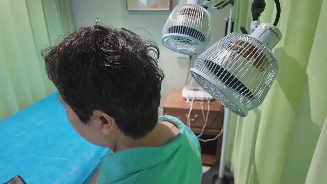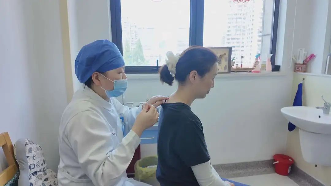 巧合的是,陈阿姨今天也来到服务点进行针灸理疗。大夫在她的肩颈部和头部的一些穴位上精确扎针,然后用仪器加热。经过一番操作,陈阿姨长舒一口气,感到紧绷的身体放松了许多。陈阿姨感慨地说:“我肩膀和脖子疼,但是我有老问题。当我打开空调时,我感到非常痛苦。我觉得脖子又硬又酸又肿,头也不能过来,特别难受。但是这么热的天,不开空调根本受不了,所以我就把中医理疗的频率提高了一些。来这儿打一针,效果很明显,感觉身体一下子就松了,不像以前那么僵硬了。注射完之后,再照一照仪器,整个人都舒服多了。以后看情况,再拔罐,那就更舒服了。”