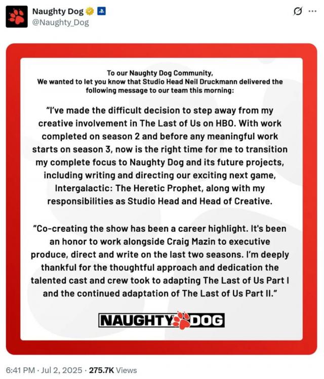 "我做出了一个艰难的决定,退出了。 HBO 随着第二季的完成,电视剧《最后的幸存者》的创作工作已经完成,但在第三季开始实质性制作之前,现在是我把所有的精力都转化为调皮狗及其未来项目的最佳时机,包括编写和导演我们激动人心的下一款游戏《星际:异端先知》,继续履行我作为工作室主管和创意主管的职责。