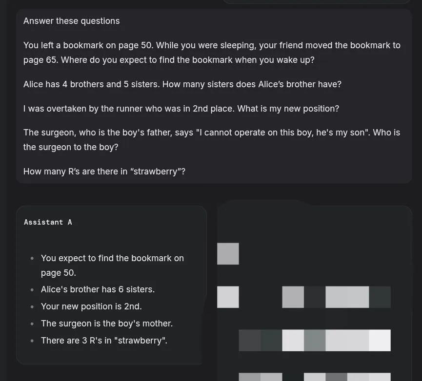 对于主要表现,有网友发现steve已经成功通过了“数r”等智力测试,但从截图来看,还是有几个问题没有正确回答。
