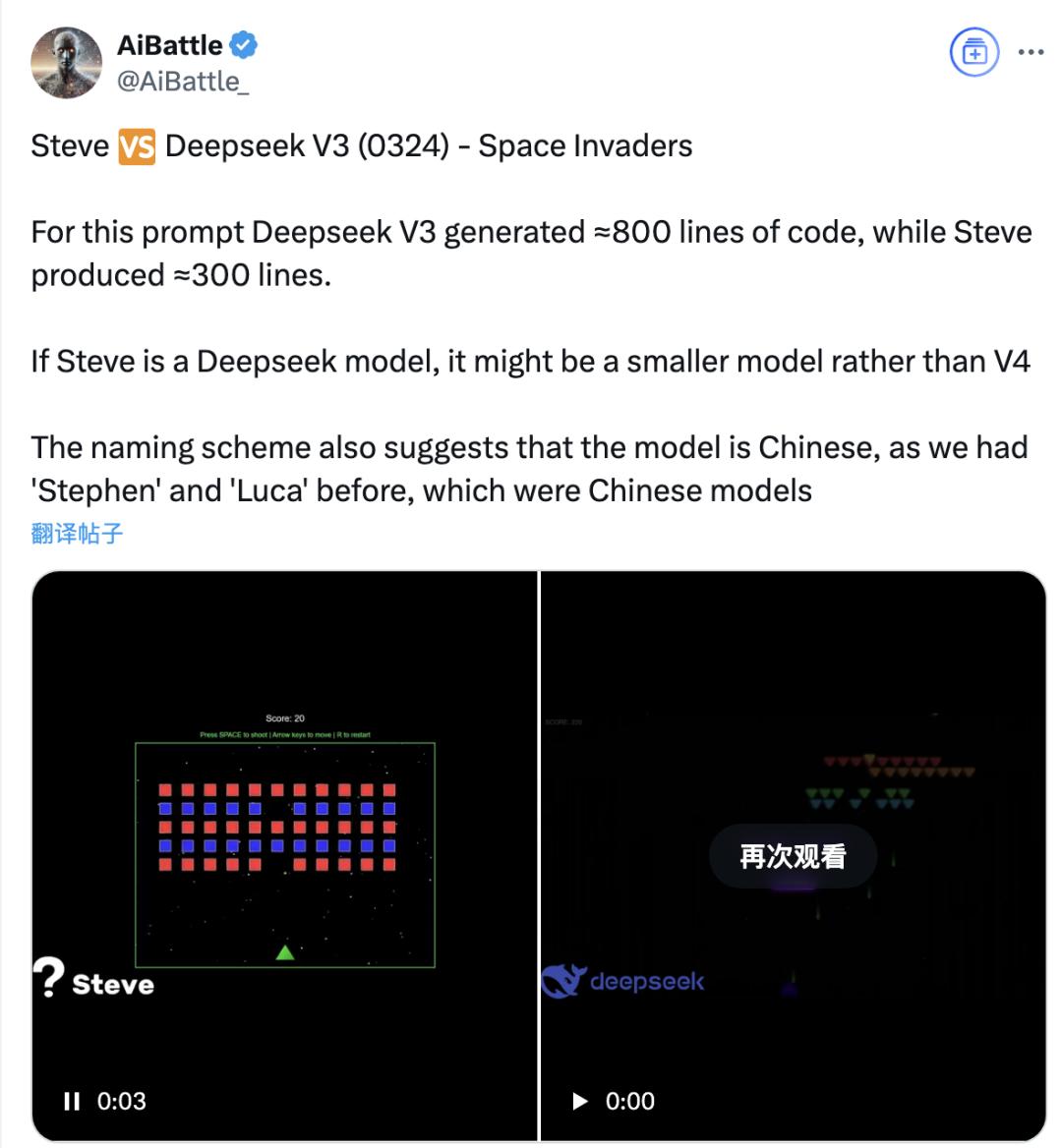 另一些人将steve与V3进行比较,让他们分别编写游戏代码,从长度上看,V3输出了大约800行,而steve只有大约300行。