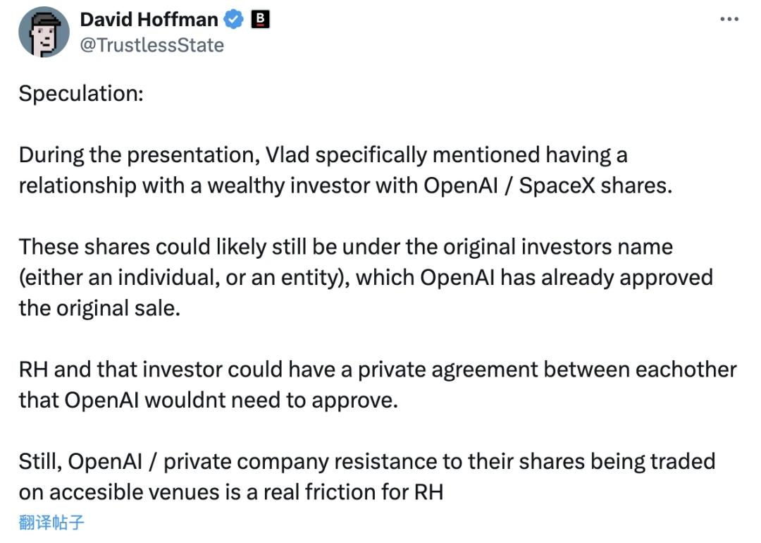 Bankless 创始人 David Hoffman 就此推断,Robinhood 也许是和某个人拥有 OpenAI / SpaceX 股票已经达成协议—— “Vlad Tenev 曾经在演讲过程中特别提到和一个人拥有。 OpenAI / SpaceX 股票所有的富有投资者都有联系,这些股票很可能仍然属于原始投资者(个人和实体),OpenAI 也有可能批准原投资者出售股份。这种情况下,Robinhood 不需要与投资者签订个人协议, OpenAI 准许。即便如此,OpenAI 等待私营企业仍然可以拒绝在可访问场所进行股权交易,这对 Robinhood 这将是一种真正的摩擦。”