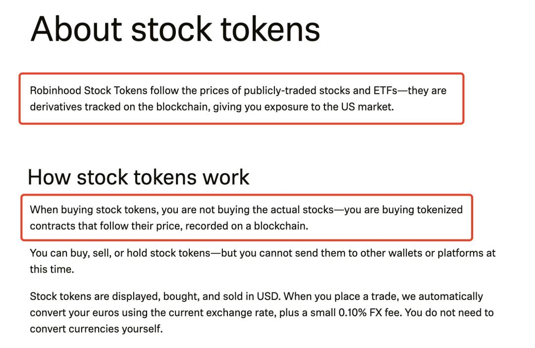 关于 Vlad Tenev 我们正在描述“代币不是股份”, Robinhood 在产品文档中找到了更详细的解释:“Robinhood 跟踪公开交易的股票代币和股票 ETF 价格,它们是区块链上跟踪价格的衍生品...当你购买股票代币时,你不是在购买实际的股票,而是在购买符合其价格并记录在区块链上的代币合同。"