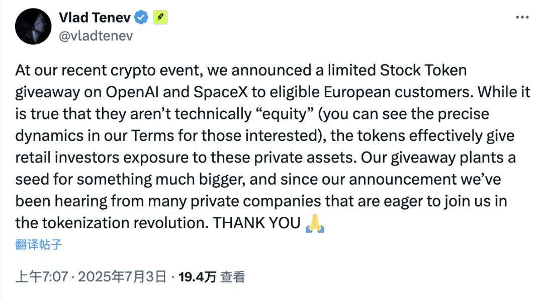 针对 OpenAI 的训斥,Robinhood 联合创始人兼 CEO Vlad Tenev 于 X “在我们最近的数字货币活动中,我们宣布将限量向符合条件的欧洲客户赠送合格的数字货币活动 OpenAI 和 SpaceX 股票代币。虽然严格来说,这些代币并不是“股份”(感兴趣的朋友可以查看我们的条款了解具体内容),但它们实际上为散户提供了接触这些私有资产的机会。我们的礼物活动为更大的计划奠定了基础。自从我们宣布以来,我们收到了许多私营企业的来信,他们渴望加入我们,共同参与这场令牌革命。"