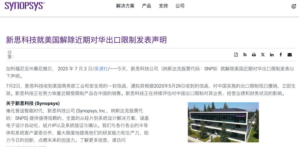 关于收到消除出口限制的通知,新思科技官网发布的声明