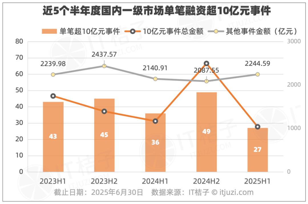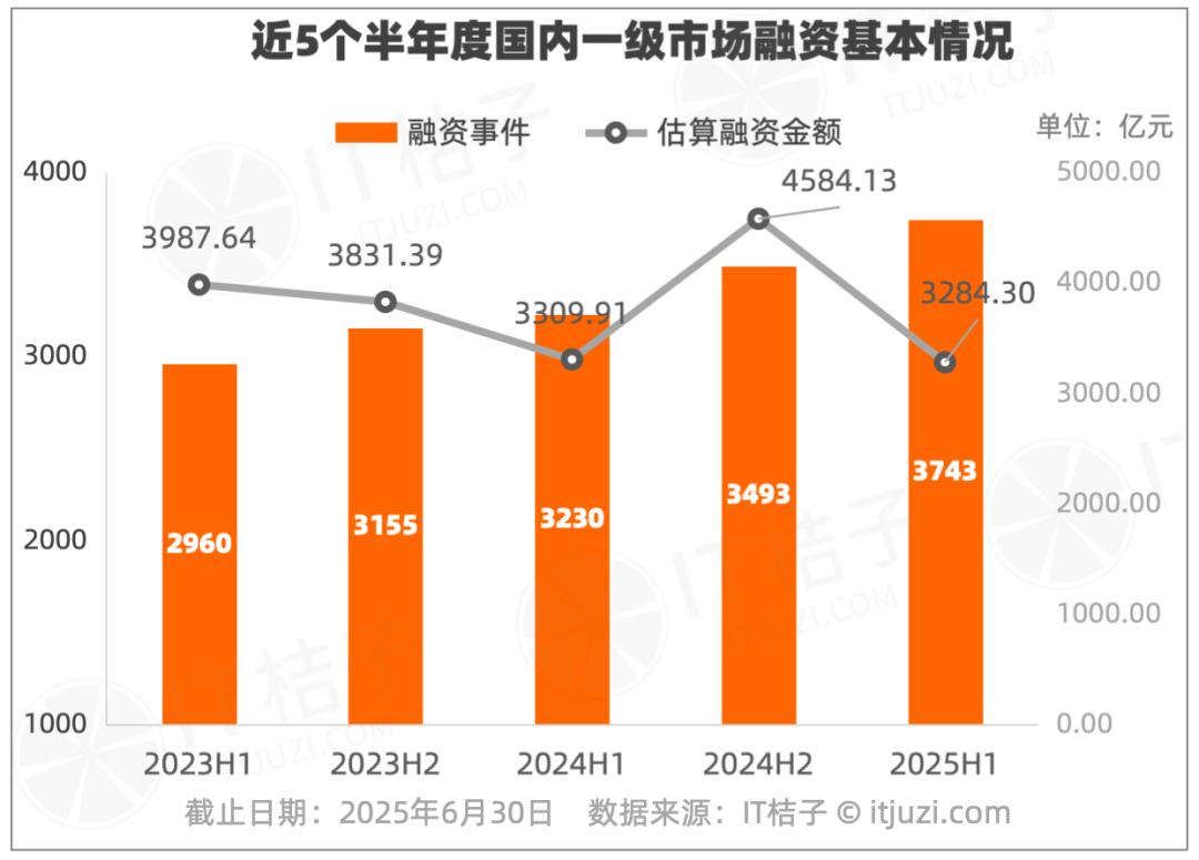 根据IT橘子数据,近5个半年来,国内一级市场股权投资交易量持续增长,从2023年H1的2960笔增长到2024年下半年的3493笔。到2025年上半年,融资交易量达到3743笔,同比增长16%,环比增长7%。