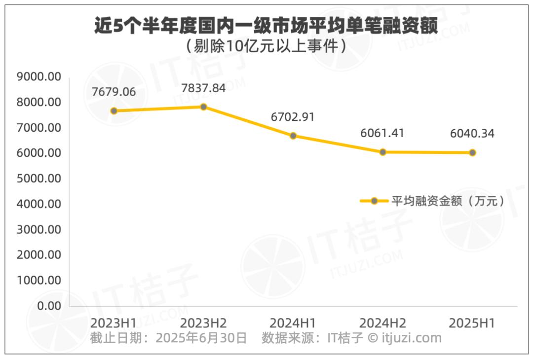 到2025上半年平均每笔融资金额同比下降662万元,这是6040.34万元;与两年前相比,这一数字下降了1638.72万元。