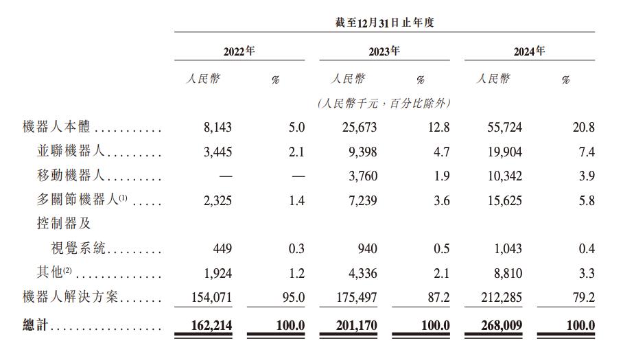 从2020年到2024年,机器人本体收入占比从5.0%上升到20.8%,机器人解决方案的收入占比从95.0%下降到79.2%。