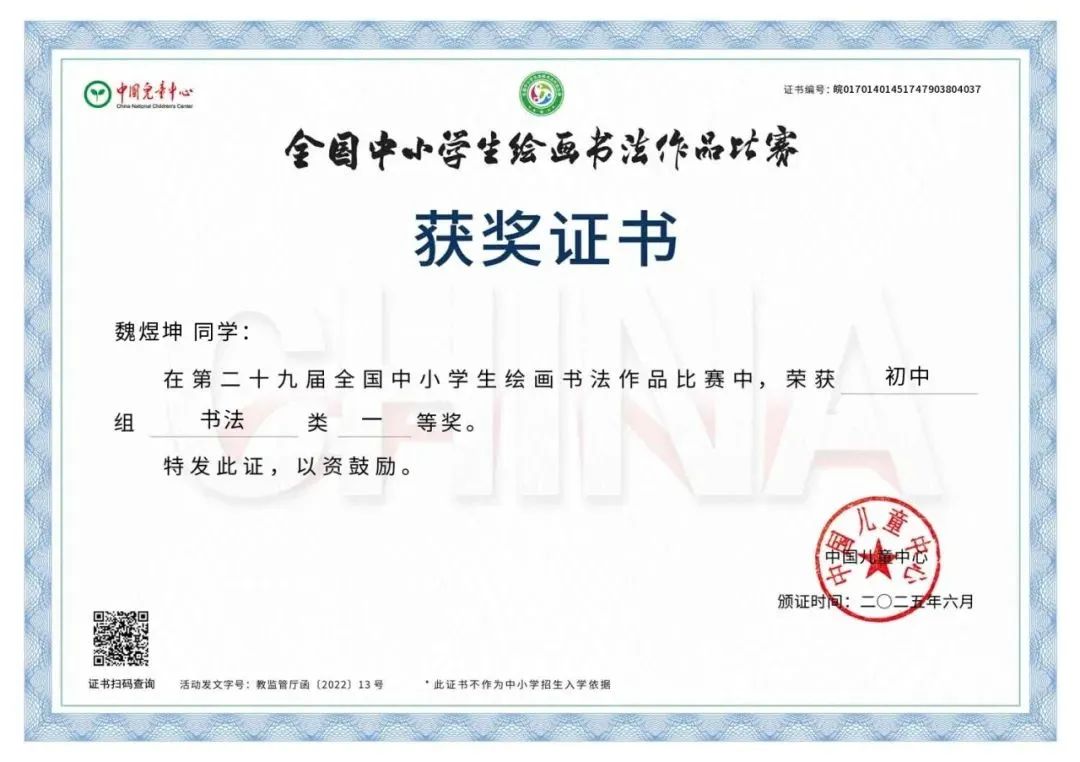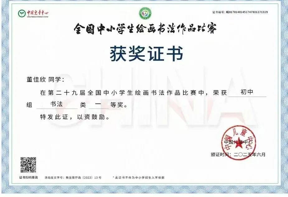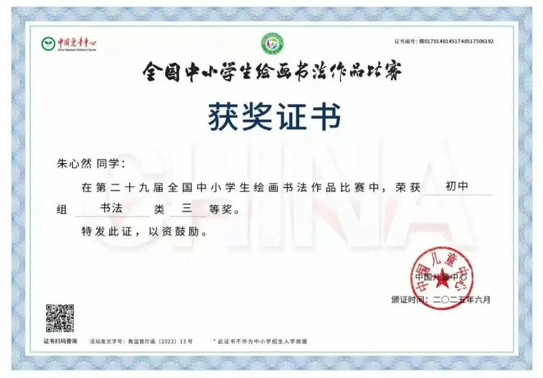 近日,第29届全国中小学生绘画书法作品成果正式公布。大量经典作品在省级赛区组委会初步评审、全国组委会组织专家线上核查、专家评审会线下最终评审等程序中脱颖而出。我县13名中小学生凭借主题鲜明、健康向上、富有感染力、创造性的创作优势获奖。其中,7名一等奖、3名二等奖、3名三等奖。