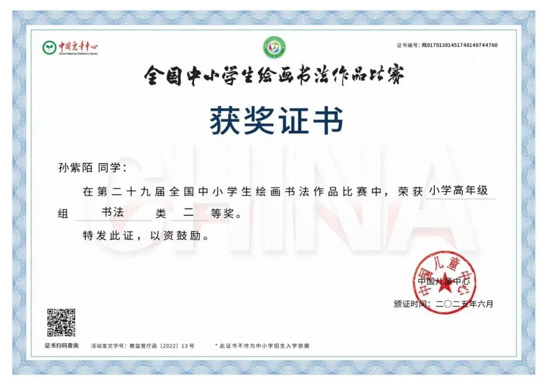 经教育部批准,由中国儿童中心主办的全国中小学生绘画书法作品大赛。本次比赛,以“我喜欢的中国风”为主题,分为34个赛区组织。参赛作品包括绘画(包括绘本)、书法、拍摄、造型、数字艺术五种艺术形式,分为四个等级:小学低年级组、小学高年级组、初中组和高中组(包括职业高中和中专)。通过比赛,引导青少年提高文化理解、审美感知、艺术表现、创造性实践,丰富精神文化生活,促进身心愉悦、人格健全,培养美育情怀。