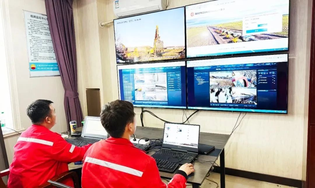走进虎林-长春1标段项目部视频监控室,4个电子屏幕实时同步施工现场图片。监控人员可以随时检索任何工作区域图片,放大到主屏幕进行详细检查。它不仅是安全管理的“神经中枢”,也是“数字战场”。