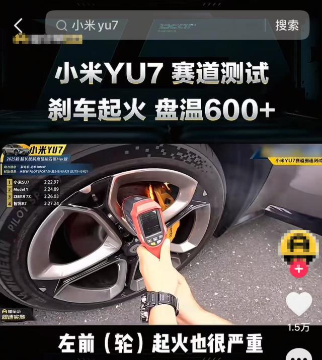 结果跑完一看,YU7 虽然圈速第一,但是前轮刹车处的火焰呼呼向外跳,刹车盘温度高达 600 多次,这一次被网友们喷得很惨。