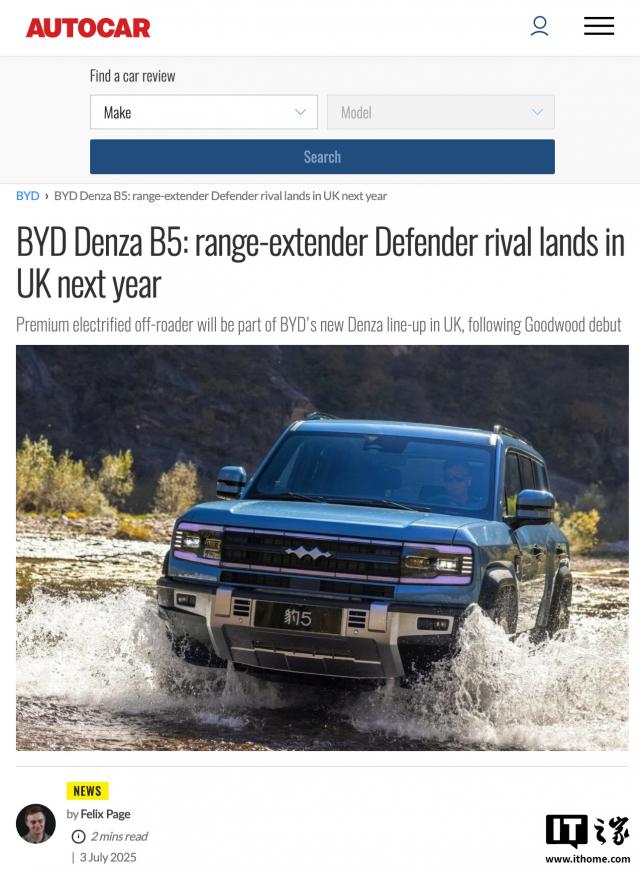 IT 世家 7 月 3 据外媒报道,每日消息 Autocar 据今天报道,比亚迪将在英国推出全新车型 剑指路虎护卫,B5。报道豹子 5 定义为“定位高端增程式四驱” SUV "越野性能极佳,动力水平"堪比超跑"。