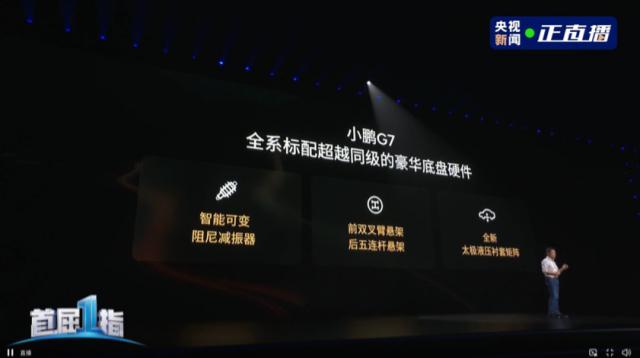 小鹏 G7 还将整个系统标配“超越同级”的豪华底盘硬件:前双叉臂智能可变阻尼减振器 后五连杆悬架,太极液压衬套矩阵。