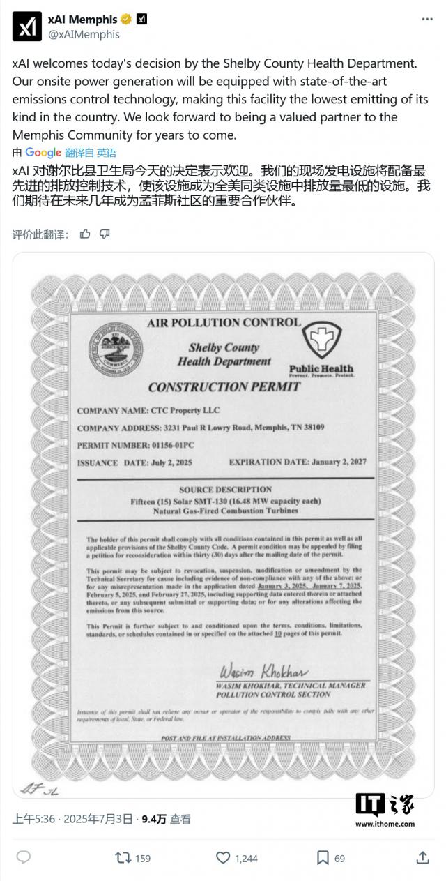 IT 世家 7 月 4 科技媒体日新闻 Ars Technica 昨日(7 月 3 日本)发布博文,报道称 xAI 孟菲斯位于美国田纳西州。(Memphis)的数据中心获得气体排放许可证,支持运行 15 台式天然气涡轮机。
