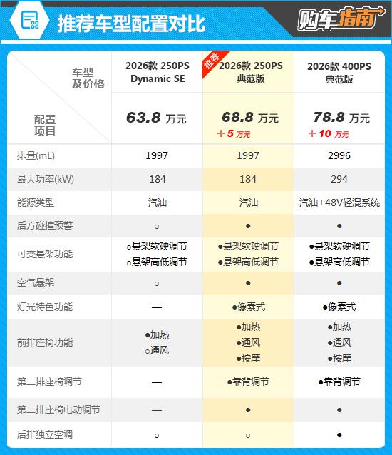 与顶部版本相比,推荐车型的配置性能差别不大,主要区别在于动力装置。鉴于 2.0T 对于日常用车的需求,发动机的动力储备已经足够了,升级 3.0T 引擎成本较高,而且后期维修费用也突然增加,所以重要性不强。