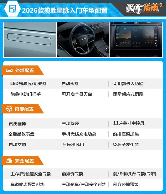 2026 路虎揽胜星脉的入门级车型提供了可开启全景天窗、无勺进入功能、手机无线充电功能、前排座椅加热、后排出风口、自动空调等相对完整的基本功能。但是对于一款来说,起步价高达 56.8 豪华品牌万元 SUV 就基本功能而言,只有基本功能自然不能满足潜在用户对设备的需求,这也是这次不推荐入门级车型的主要原因。