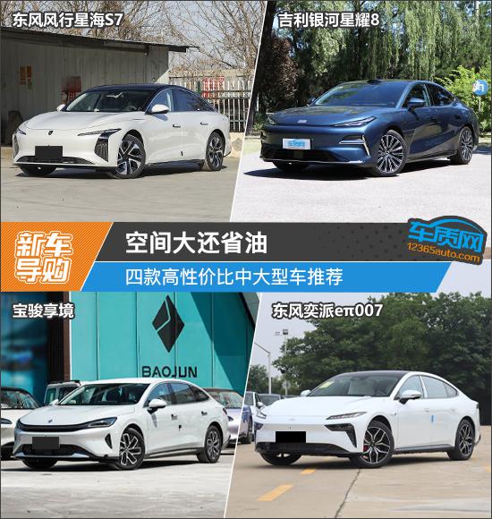 今日为您推荐四款性价比高的中大型汽车,分别是东风风行星海 以下简称S7:星海 S7)、吉利银河星耀 8(以下简称:银河星耀 8)、宝骏享境,东风奕派 e π 007(以下简称:e π 007)。其中,星海 S7 它是东风风行星海旗下的第二款车,具有动感轿跑车身设计;银河星耀 8 是今年 5 全新车型月刚上市,基于吉利 GRA 打造全球智能新能源结构;宝骏享境是宝骏品牌焕新后的旗舰佳作,具有良好的产品实力;e π 007 它是东风奕派旗下的第一款车型,拥有丰富的智能设备。
