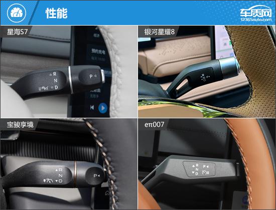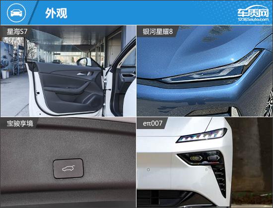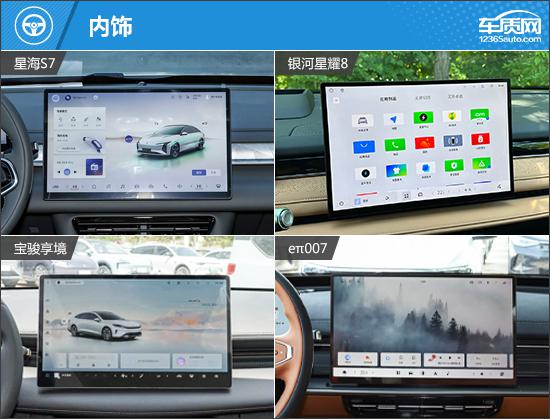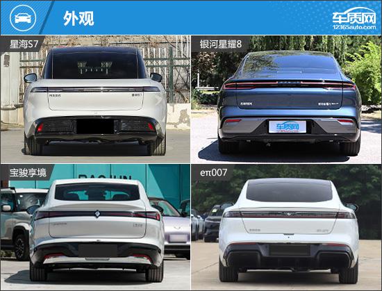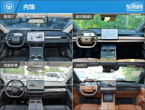 外观方面,虽然四款车型的设计风格相似,但也有自己独特的亮点。星海 S7 大灯造型最夸张,采用类似的“ 7 “字形大灯,很有未来感;银河星耀; 8 沿用波澜美学语言,整个正面非常简单,非常有气场;宝骏配备了传统的前格栅,与大灯相连,加上闪电形状。 LED 日间行车灯,识别度好;e π 007 唯一选择分离式大灯的车型,里面是矩阵灯源的布局,看上去很神奇。车尾方面,除了银河星耀之外 其它三款车型均采用贯穿式尾灯组,为车尾增添了不少层次感。车尾方面,除了银河星耀之外 其它三款车型均采用贯穿式尾灯组,为车尾增添了不少层次感。银河星耀 8 尾灯采用类似贯穿式的风格,内部还增加了大量的点阵式灯源,点亮后极具辨识度。
