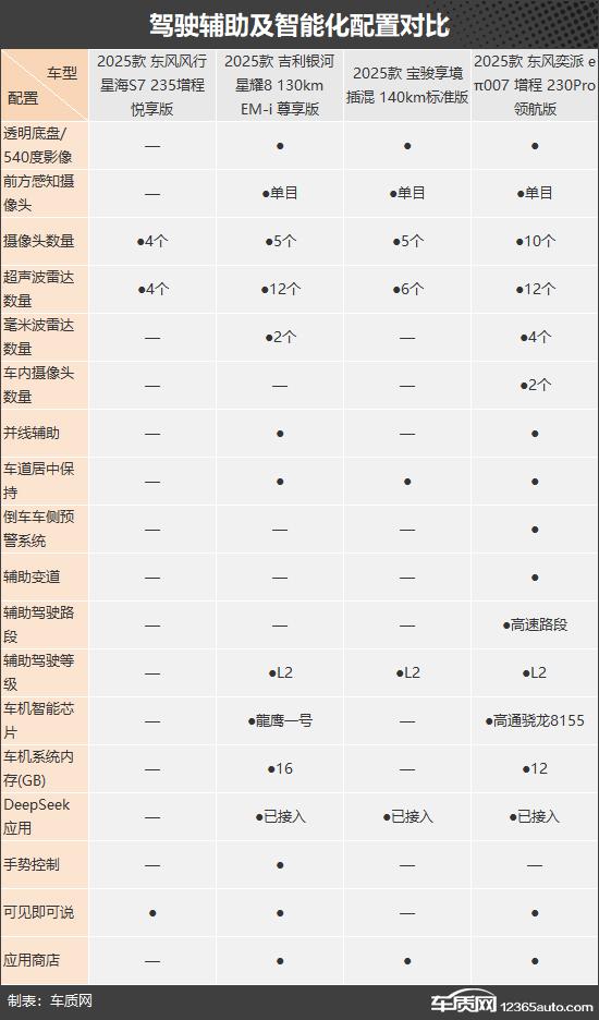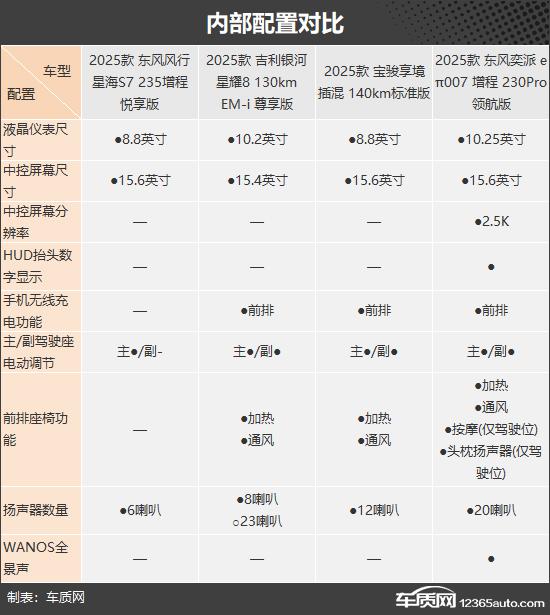 这次推荐的四款中大型车各有特色,星海 S7 虽然配置平平,但动感的滑背造型、无框设计门和场景灯语的加入更容易吸引年轻消费者;银河星耀 8 在空间上有一定的优势,舒适性配置也很出色,适合家庭用户;宝骏享境各方面表现均衡,没有明显的缺点,也是四款车中唯一配置前的配置。 / 多层隔音玻璃车型的后侧窗,可保证车内的安静;e π 007 胜利在于配置丰富,无论是内部配置、安全配置还是驾驶辅助配置,都是四款车中性能最好的,适合对配置要求较高的客户。
