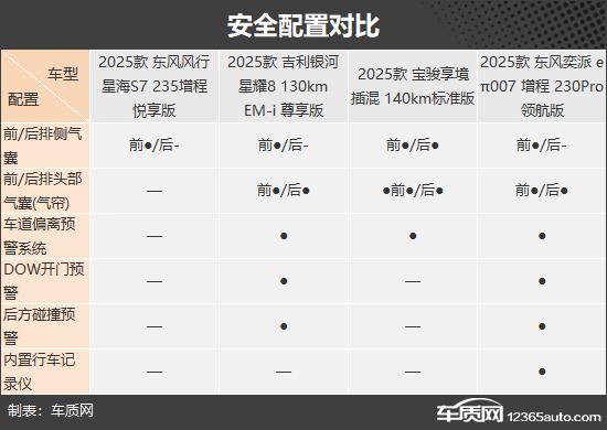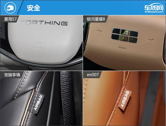 安全性配置方面,e π 007 性能最好,配置丰富的主人。 / 被动式安全配置,还专属于内置行车记录仪,无需后期安装和改线,非常实用。相比之下,星海 S7 整体表现存在一些不足,主要表现 / 在日常驾驶中,被动安全配置存在一定的缺失,需要多加注意。