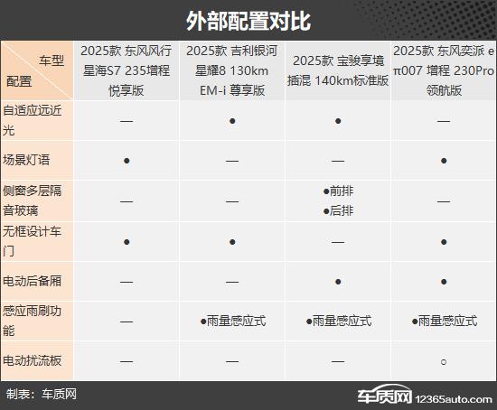 在外部配置方面,宝骏享境与 e π 007 其表现相对较好,前者配有自适应远近光, / 后侧窗多层隔音玻璃;后者配有场景灯和无框门,各有特色。而且两款车型都配有电动后备箱,日常使用更方便。相比之下,星海 S7 外部设备略有不足,是四款车中唯一没有感应雨刷功能的车型。