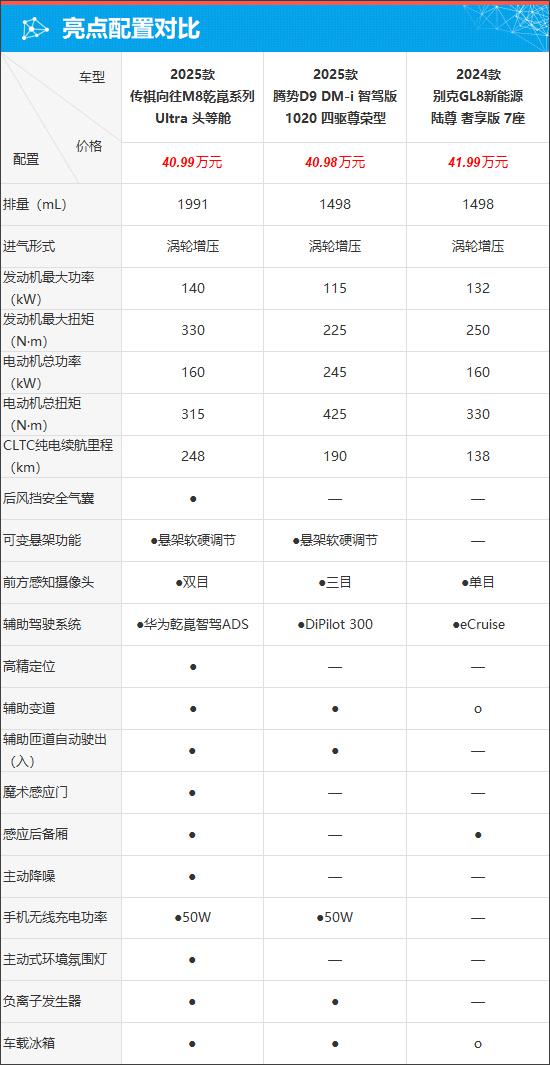 车型数量部分,腾势 D9 推出了纯电动和增程式两种动力配置,如果算上停工在售车型,共有多达 13 款。别克 GL8 新型能源有两个系列:陆尚和陆尊,考虑到市场定位和价格,只有陆尊系列。 4 车辆符合标准。相比之下,传祺憧憬 M8 只提供干部系列 3 车型配置,虽然车型数量不多,但高、中、低的组合搭配在选择时确实十分简洁明了。