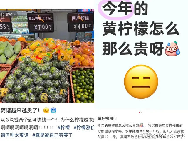 “今年柠檬涨价太明显了。去年买了四川安岳黄柠檬,两个只有2.99元,今年变成了7.99元。”“为什么今年柠檬这么贵?记得去年在水果摊买了5块钱/斤。前几天买了12块钱/斤。我真的不敢想有一天柠檬会卖到10块钱以上。”“去年在电商平台花了15块钱买了5斤柠檬,今年打开链接需要55块钱。我的天塌了...很多人在社交媒体平台上吐槽柠檬价格昂贵。