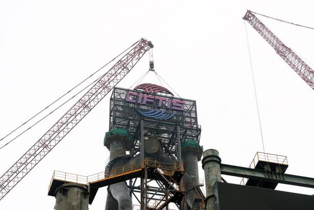 7 月 1 一天早上,首钢园四高炉的巨大钢身在雾中屹立不倒。随着指令的发布,巨型起重机伸展了长臂,承载着服务贸易会 LOGO 巨型面板缓缓离地,在晨光中稳步上升。经过三个小时的精确操作,服务贸易会 LOGO 最后稳稳地嵌入四高炉顶,为这个钢铁巨人戴上一枚勋章,等待九月全球目光聚焦。