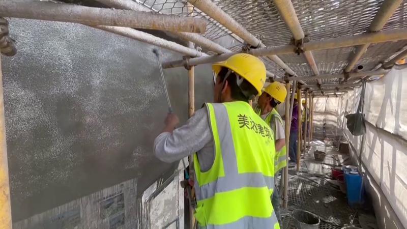 而且水刷石的修复也很费劲,因为墙上的水刷石有两种规格,市场上很难找到现成的。美达公司重庆公寓项目负责人陆佳告诉记者:“我们这次装修的水刷石有两种规格,一种是线上,配合比是1mm到2mm的碎石。另外一个是大面,2-4毫米。在进行小面积试样之前,我们将3-5毫米的石头对比筛选出2-4毫米。样品经专家核对后,在专家和设计确认后,我们进行了大规模的修复。”“修理工作中有接缝,新老之间有接缝。在新旧接缝之间的处理中,需要一位熟练的老师傅将这条缝切成小缝,然后在中间补上一块块碎石。加密后,再用一种我们的平色剂进行平色,可以达到近看稍有痕迹,远看可以达到完美的效果。”