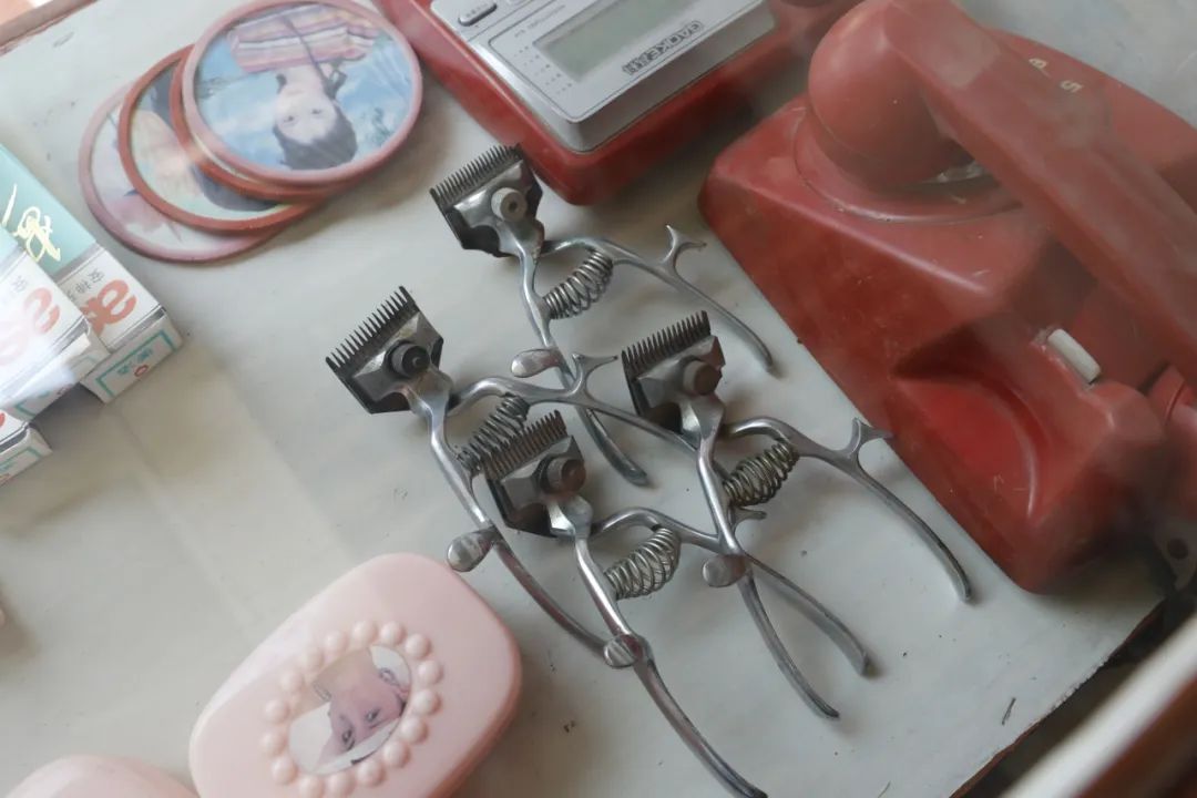 “当我们还是个孩子的时候,剪头发不像现在这样方便。我们仍然使用这种理发。每次剪头发之前,理发师都要在推子上的刀头上加润滑油,否则剪刀头会卡在头发上,这叫疼。”“80后”何至宏指向橱柜里的理发推。