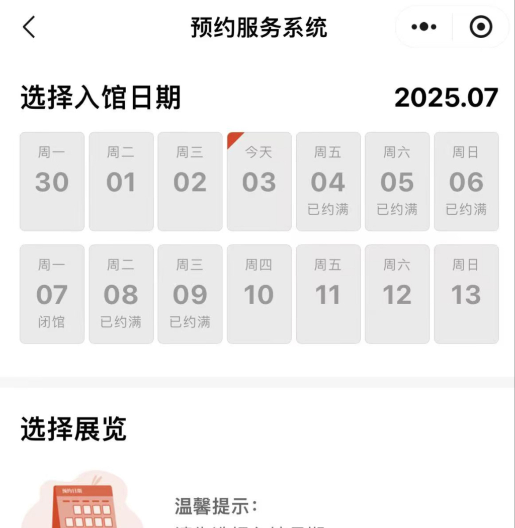 本报记者登陆陕西历史博物馆本馆预约小程序,发现下周一之前的门票也已全部预约。中国的博物馆和故宫博物院没有机会参观预约小程序。直到7月16日,上海博物馆的人民广场馆都处于约满状态。这些顶流博物馆坚持预约制度是有原因的。超饱和的人流导致设施故障频繁发生。此外,当观众在展厅里接踵而至时,陈列柜中的文物安全将面临巨大挑战。