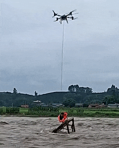 消防队员操作无人机将男子吊起。